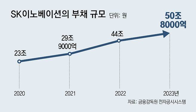 SK이노베이션은 그룹 핵심 계열사다. 하지만 자회사 SK온의 부진으로 휘청이고 있다. SK이노베이션의 배터리 사업부가 분사해 설립된 SK온은 공장당 최소 수조 원대의 초기 투자 금액이 필요했던 만큼 모회사를 비롯해 다양한 투자처로부터 지분 투자와 차입 등을 통해 자금을 유치했다. 하지만 최근 전기차 시장이 주춤하면서 2022년 1조727억 원, 지난해 5818억 원 적자를 냈다. IPO를 조건으로 외부 투자자를 유치했으나 사업이 어려워지며 IPO 시점도 미뤄지고 있다. 차입금이 치솟으며 SK이노베이션의 연결 기준 총부채도 2020년 23조 원에서 지난해 50조8000억 원으로 급증했다.