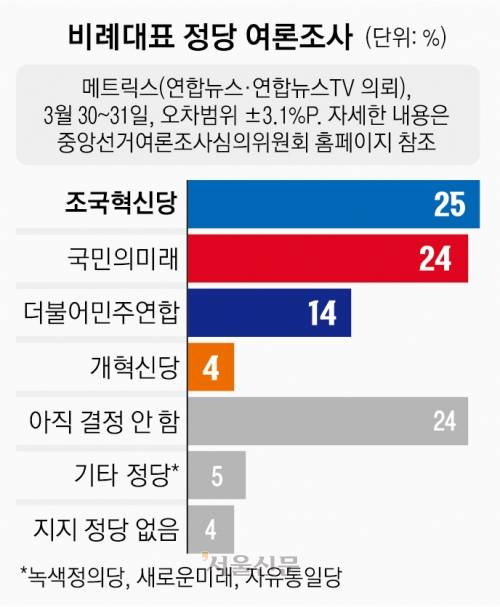 3일 여론조사업체 메트릭스가 연합뉴스와 연합뉴스TV의 의뢰를 받아 지난달 30~31일 전국 남녀 유권자 1000명을 조사해 발표한 결과 비례대표 후보 지지율은 조국혁신당이 25%로 선두였다. 이어 국민의미래(24%), 더불어민주연합(14%), 개혁신당(4%) 순이었다. 오차범위(±3.1% 포인트) 안이지만 조국혁신당의 지지율이 국민의미래를 앞선 건 처음이다. 자세한 내용은 중앙선거여론조사심의위원회 홈페이지를 참조하면 된다.