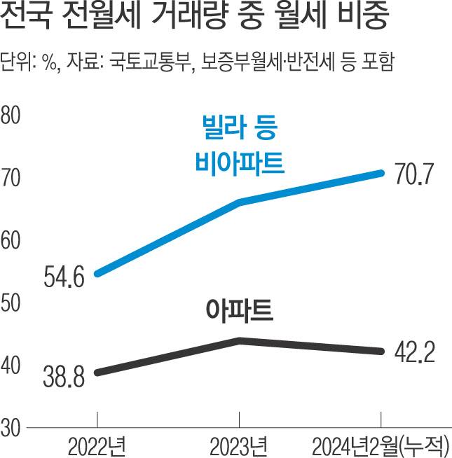 주택시장에서 ‘빌라는 월세, 아파트는 전세’가 대세로 굳어지는 분위기다. 빌라는 전세사기 여파로 월세 비중이 역대 최고치를 기록했다. 아파트는 매매시장 침체와 시중금리 하락으로 전세 수요가 커지면서 전세가격이 반년 넘게 상승세를 기록하고 있다.