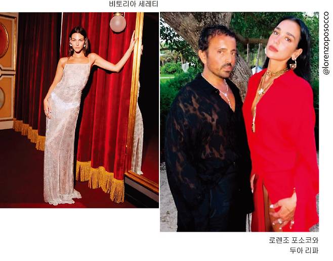 데일리 룩부터 화려한 무대의상, 레드카펫 룩까지. 두아 리파의 모든 스타일을 책임지고 있는 로렌조 포소코는 MTV에서 스타일링 어시스턴트로 커리어를 시작했다. 현재 두아 리파를 비롯해 톱모델 비토리아 세레티, 트로이 시반이 그의 주 고객. 이탈리아 출신답게 1990년대와 이탈리아에서 영향을 많이 받는다고 한다. 2023년 멧 갈라에서 두아 리파가 선보인 화이트 드레스 역시 샤넬의 1992년 제품. 로렌조 포소코는 디자이너 톰 포드나 지아니 베르사체를 동경하는 만큼, 여성의 몸이 가장 아름다워 보이는 볼드하고 섹시한 룩을 선호한다. 그 때문인지 베르사체 의상을 입은 두아 리파의 모습을 쉽게 찾아볼 수 있다.