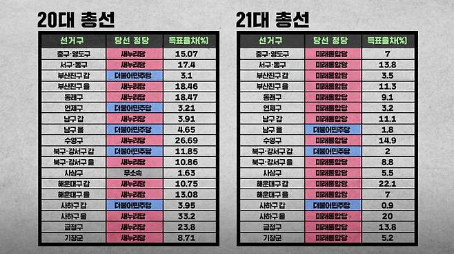 하지만 4년 뒤 21대 총선에서 민주당은 의석 수를 늘리는 데 실패했습니다. 민주당은 4년 전 가져왔던 부산진갑, 연제구에서 패하며 미래통합당에 다시 2석을 내주고 맙니다. 부산에서 민주당이 승리한 곳은 남구을, 북·강서 갑, 사하갑 3곳입니다.