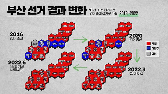 21대 총선이 전국적으로 민주당에게 우세한 판세였다는 걸 감안하면, 미래통합당의 부산 성적표는 기대 이상일 정도로 부산은 보수 텃밭의 면모를 보여줬습니다. 그 이후 치러진 20대 대통령 선거와 제8회 부산시장 선거에서도 국민의힘은 부산에서 압승을 거뒀습니다. 그렇게 부산은 민주당이 한동안 넘볼 수 없는 지역으로 굳어지나 싶었습니다.