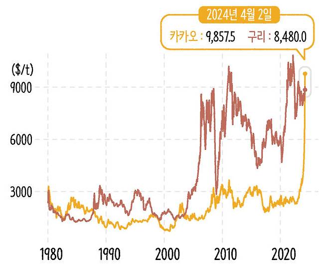 현재 코코아의 가격은 구리보다 더 비쌉니다. 최근 구리가 AI나 전기차 시장이 커지면서 관련 인프라의 핵심 재료로 각광받고 있거든요. 구리 수요가 늘어나서 가격이 오르고 있는데, 4월 2일 가격을 살펴보면 톤당 9천 달러가 되질 못합니다. "구리, 코코아보다 싸다!"를 붙여놓고 광고해도 될 정도로 가격 차이가 벌어져 있습니다.