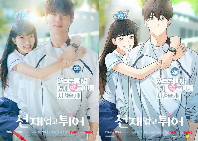 이 가운데 ‘선재 업고 튀어’ 측은 4일(목) 싱크로율 포스터를 공개해 이목을 끈다. 이는 카카오페이지 웹툰 ‘내일의 으뜸 : 선재 업고 튀어’의 둥둥 작가가 ‘선재 업고 튀어’의 첫 방송을 기념해 웹툰 버전으로 작화한 포스터인 것.