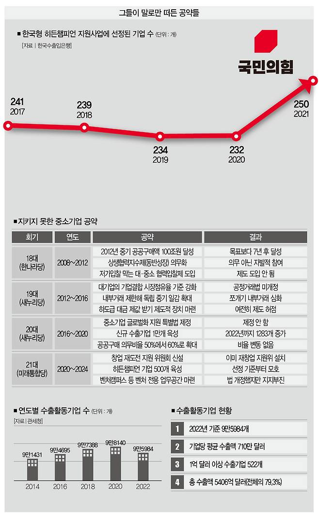 2016년 20대 총선에선 중소기업 글로벌화를 지원하기 위한 특별법을 제정하겠다 약속했지만 이뤄지지 않았다. '신규 수출기업 1만개 육성' 공약은 검증조차 안 된다. 평상시에도 매년 2만개 이상의 수출기업이 신규로 진입하거나 퇴출하고 있어서다. 중소기업 제품 공공구매 의무비율을 50%에서 60%로 확대하겠다는 약속도 잊힌 지 오래다.