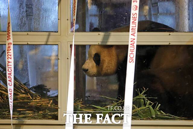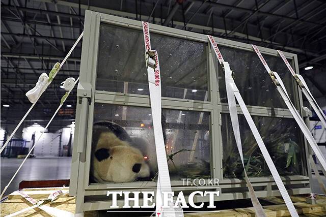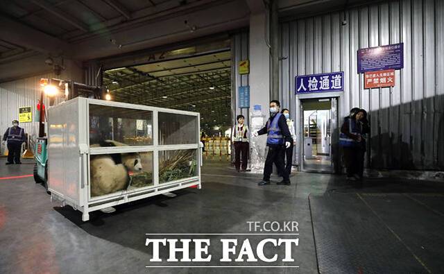 [더팩트ㅣ서예원 기자] 자이언트 판다 푸바오가 3일(현지시간) 중국 남서부 쓰촨성 청두 솽류국제공항에 도착한 가운데 관계자들이 이송 작업을 하고 있다.