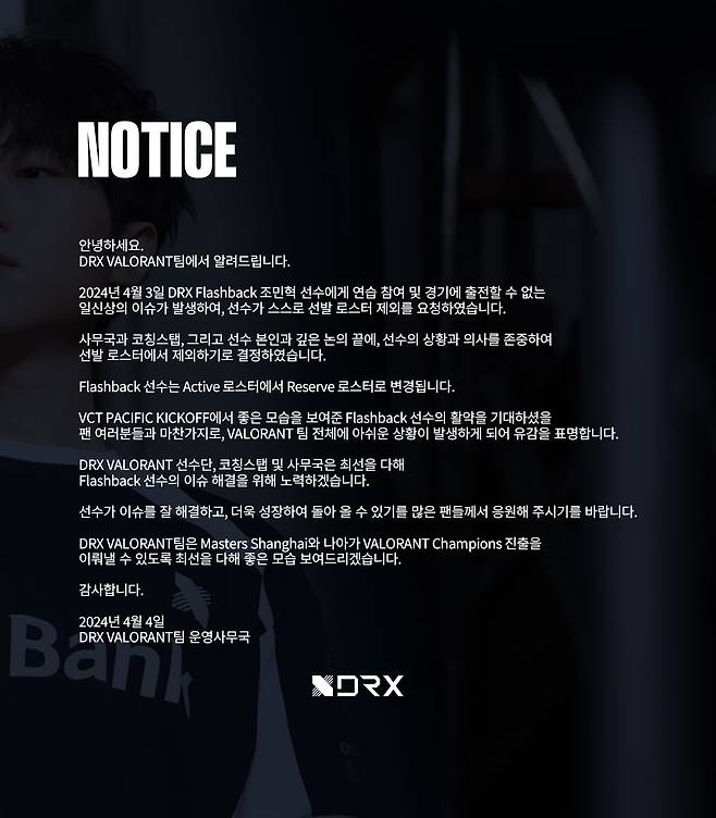 DRX 발로란트 팀은 4일 SNS을 통해 "'플래시백' 조민혁에게 연습 참여 및 경기에 출전할 수 없는 일신상의 이유가 발생해 선수가 스스로 선발 로스터 제외를 요청했다"고 밝혔다.