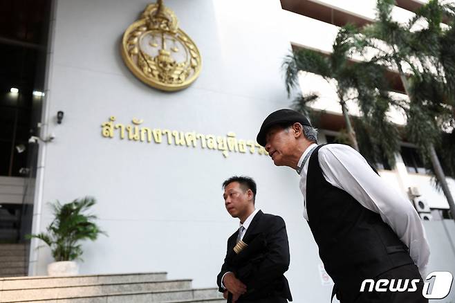 청원자인 쿵왈 부디바니드(오른족)씨가 변호사와 함께 4일 방콕 형사법원에 들어서고 있다.