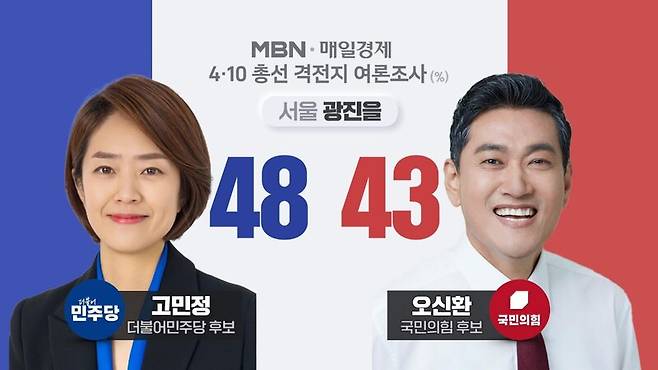 더불어민주당 고민정 후보가 48%의 지지를 얻었고 국민의힘 오신환 후보가 43%의 지지율을 기록했습니다.