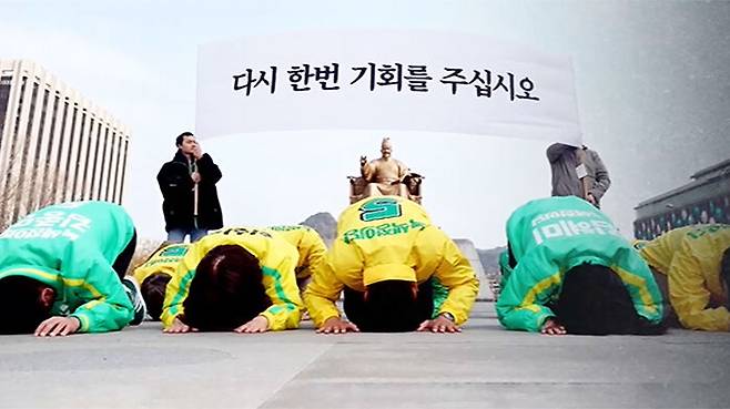 다시 한 번 기회를 달라는 현수막을 걸고, 지난 4년간 노동자와 소수자를 대변한다는 초심을 잃은 적이 많다고 반성하며 무릎 꿇고 큰절을 했습니다.