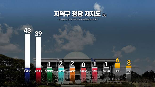 저희 SBS가 여론조사 공표 금지 기간 전인 지난 1일부터 3일까지 사흘동안 전국 유권자들을 대상으로 여론조사를 진행했습니다. 지역구 정당 지지도는 거대 양당이 오차범위 안에서 접전인 것으로 나타났습니다.