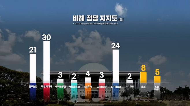 국민의미래 30%, 조국혁신당 24%, 더불어민주연합 21% 순으로 나타났습니다.