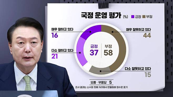 윤석열 대통령의 국정 운영에 대해서는 잘하고 있다는 긍정평가는 37%, 잘못하고 있다는 부정평가는 58%로 나타났습니다.