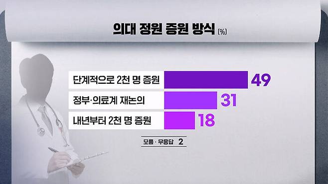 증원 방식에 대해서는 2천 명을 더 늘리되 단계적으로 추진해야 한다가 49%, 정부와 의료계의 재논의를 통해 증원해야 한다 31%, 내년도 입시부터 2천 명을 증원해야 한다는 응답은 18%로 나타났습니다.