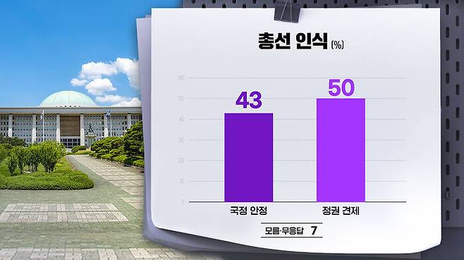 국정안정을 위해 여당에 힘을 실어줘야 한다 43%, 정권 견제를 위해 야당에 힘을 실어줘야 한다 50%였습니다.