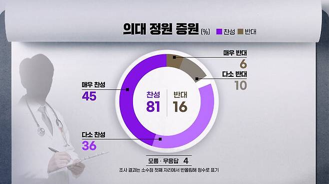 현안인 의대 정원 증원에 대해서는 매우 찬성한다 45%, 다소 찬성한다 36%로, 찬성이 81%, 반대는 16%였습니다.