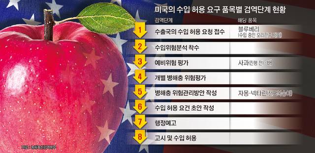 미국은 1993년 우리 정부에 사과 수입위험분석을 신청했다. 현재 8단계 가운데 2단계(수입위험분석 착수)를 마치고 3단계(예비위험평가) 진행을 기다리고 있다. 정부는 세계무역기구(WTO) 동식물 위생·검역(SPS) 조치에 관한 협정에 맞춰 국내 금지 병해충의 유입을 막는다는 취지로 분석 절차를 면밀히 이행하고 있다. 충분한 위험 분석 없이 수입이 허용될 경우 외래 병해충 유입, 생산량 감소, 타작물로 피해 확산 등이 우려되기 때문이다. 실제로 미국에서 들여온 사과묘목을 통해 유입된 것으로 추정되는 과수 화상병 때문에 2015∼2023년 매년 평균 612억원의 손실·방제 비용이 투입되고 있다.