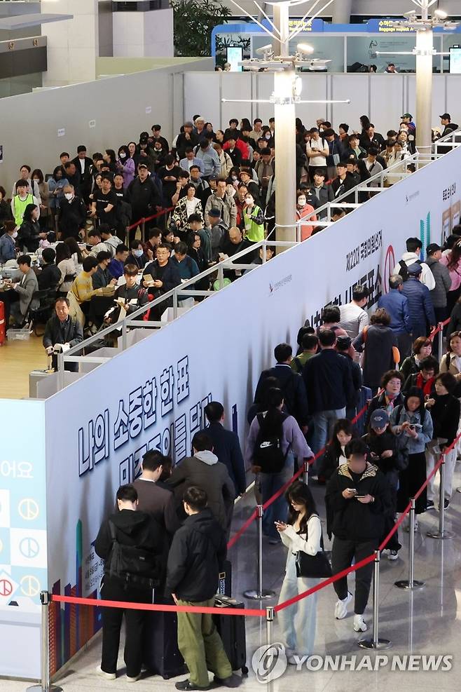 (영종도=연합뉴스) 김주성 기자 = 제22대 국회의원선거 사전투표가 시작된 5일 오전 인천공항 제1터미널에 마련된 사전투표소에서 유권자들이 투표를 위해 길게 줄을 서 있다. 2024.4.5
