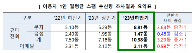 지난해 하반기 국민들이 월 평균 13.5통의 스팸 통화, 문자, 이메일을 받은 것으로 조사됐다.