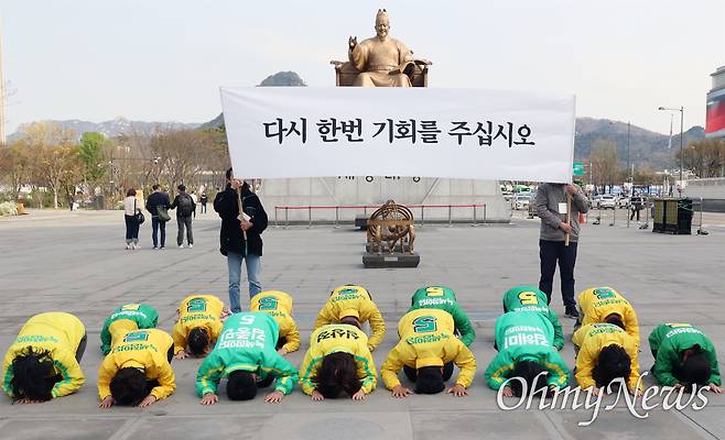 | ▲ 녹색정의당 김준우 상임선대위원장과 심상정 공동선대위원장을 비롯한 지역 국회의원 출마 후보자, 비례대표 후보자, 당직자들이 4일 오전 서울 종로구 광화문 세종대와 동상 앞에서 “녹색정의당이 초심으로 돌아가겠다. 다시 한번 기회를 달라”며 유권자들에게 절을 올리고 있다. |