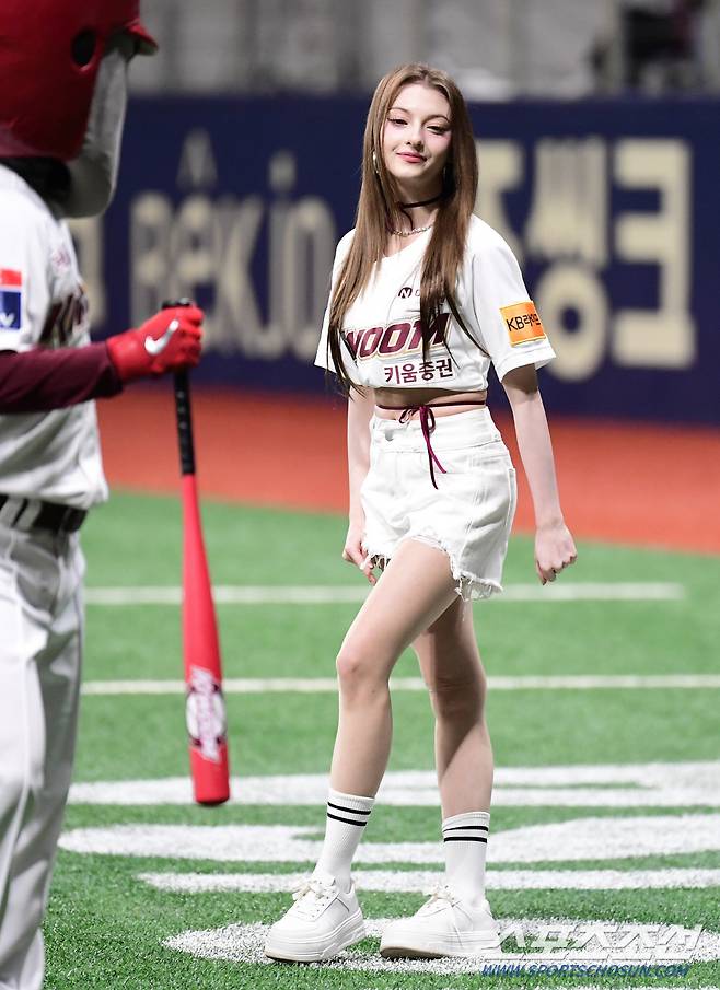 5일 고척스카이돔에서 열린 KBO리그 키움과 한화의 경기. 걸그룹 엑신 멤버 니즈와 노바가 시구 시타 행사를 했다. 시타하는 노바. 고척=송정헌 기자songs@sportschosun.com/2024.04.05/