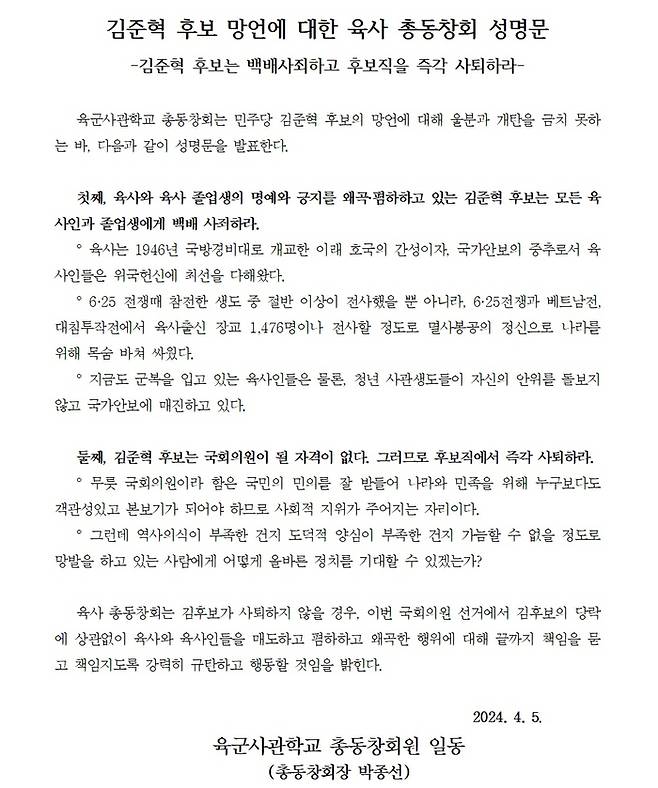 육군사관학교 총동창회는 이번 총선에 출마한 김준혁 더불어민주당 후보의 과거 육사 관련 발언을 맹비난하며 후보직 사퇴를 요구했다.