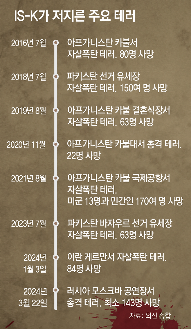 지난달 22일(현지 시간) 러시아 수도 모스크바 공연장에서 총기 난사 테러를 저질러 137명을 숨지게 한 이슬람 수니파 극단주의 무장단체 ‘IS-K(호라산)’에 대한 미국 국방부의 최근 평가다. 2015년 설립된 신생 조직인 IS-K는 짧은 연혁에도 2021년 8월 아프가니스탄 카불 국제공항 테러, 올 1월 이란 케르만에서 열린 가셈 솔레이마니 전 혁명수비대 쿠드스군 사령관의 4주기 장례식장 테러에 이어 모스크바 테러까지 자행하며 전 세계를 공포에 떨게 하고 있다.
