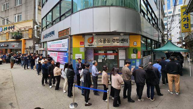 제22대 국회의원 선거 사전투표가 시작된 5일 서울 중구 소공동주민센터에 마련된 사전투표소를 찾은 유권자들이 투표하기 위해 길게 늘어서 있다. 사전투표는 6일까지 전국 3,565개 사전투표소에서 오전 6시부터 오후 6시까지 실시된다. 서재훈 기자