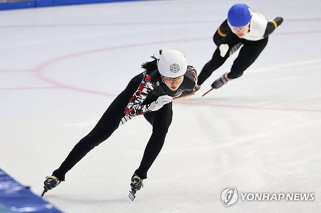(서울=연합뉴스) 서대연 기자 = 6일 오후 서울 양천구 목동아이스링크에서 열린 2024-2025 시즌 쇼트트랙 국가대표 1차 선발전 여자 500m 예선에서 심석희(흰색 헬멧, 서울시청)가 역주하고 있다. 2024.4.6