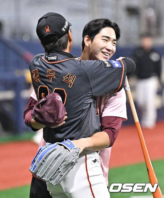경기에 앞서 한화 김우석 코치가 키움 이주형과 포옹을 하고 있다. 이 둘은 2021년부터 2023년까지 함께 LG서 코치와 선수로 함께 했다. 2024.04.06 / soul1014@osen.co.kr
