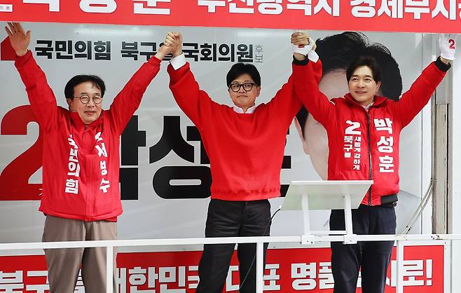 | ▲ 국민의힘 한동훈 비상대책위원장 겸 총괄 선거대책위원장이 6일 부산 북구 화명역 앞에서 박성훈 후보, 서병수 후보의 지지를 호소하고 있다. 2024.4.6 |