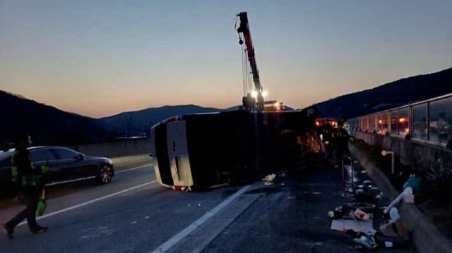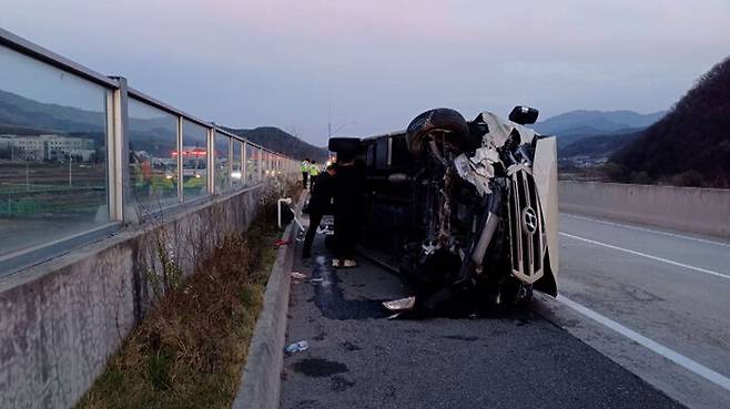 군위 고속도로서 승용차와 부딪힌 승합차 넘어져…13명 다쳐
