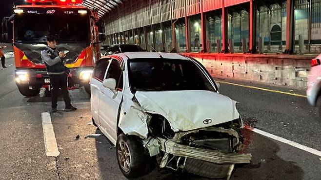 어젯(6일)밤 10시 35분쯤 부산 해운대구 장산고가교의 해운대 방향 편도 4차선 도로에서 2차로를 달리던 K7 차량이 앞서 가던 마티즈 차량을 들이받는 사고가 났습니다.