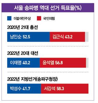 송파병은 이른바 '강남 3구(강남·서초·송파)' 가운데 진보세가 가장 강한 곳이다. 1996년 분구(分區)된 이래 치러진 6번의 총선에서 19대를 제외하면 모두 민주당계 정당이 승리했다. 오금동, 문정1동, 가락본동, 가락2동, 장지동, 위례동, 거여동, 마천동을 관할한다.특히 거여동, 마천동은 민주당 지지율이 높게 나타나는 지역이다. 철거 이주민들이 정착해 형성된 마을로 호남 출신이 많은 까닭으로 분석된다. 현역의원은 남인순(66) 의원이다. 올해 4월 총선에서도 이곳에 출마해 4선을 노린다.