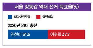 16~19대 총선에선 보수정당이 승리했으나 20·21대 총선에선 민주당(진선미 의원)이 승리했다. 22대 총선에서도 진선미(57) 의원이 민주당 후보로 나서 4선에 도전한다. 국민의힘에선 전주혜(58) 의원이 후보로 나온다. 21대 총선에선 비례대표로 국회에 입성했다. 2022년 말부터 강동갑 당협위원장을 맡아 지역을 다져왔다.