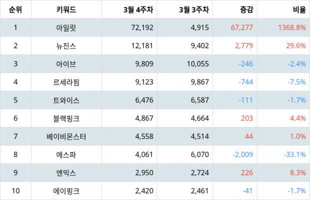 4월 1주차 걸그룹 랭키파이 분석 결과 1위를 차지한 아일릿은 트렌드 지수 72,192포인트로 전주보다 67,277포인트 상승했다.