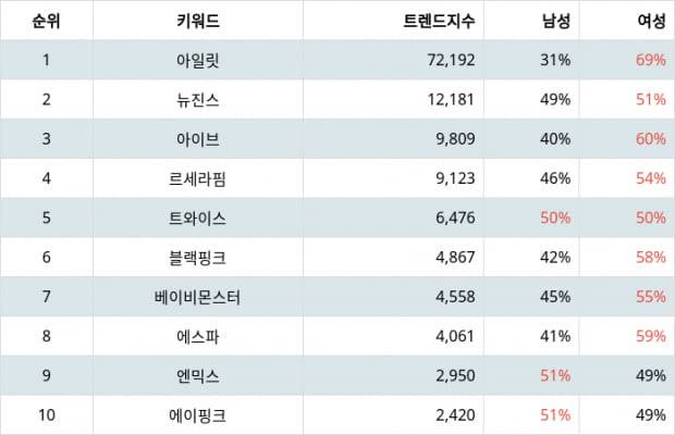 '방시혁 걸그룹'으로 불리며 흥행 돌풍을 일으키고 있는 5인조 신인 그룹 아일릿이 걸그룹 트렌드 지수에서 단숨에 1위를 차지했다.
