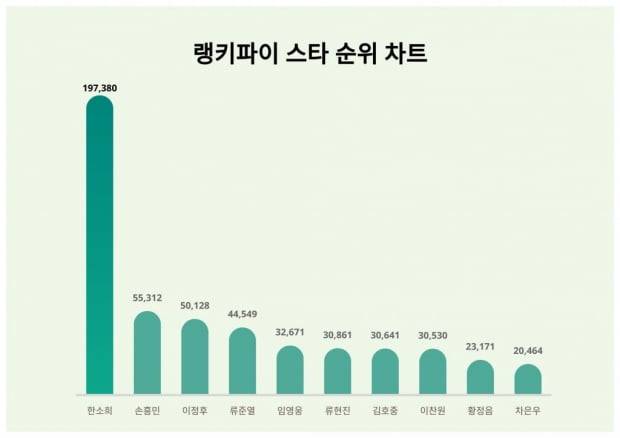 4위 류준열은 44,549포인트, 5위 임영웅은 32,671포인트, 6위 류현진은 30,861포인트, 7위 김호중은 30,641포인트, 8위 이찬원은 30,530포인트, 9위 황정음은 23,171포인트, 10위 차은우는 20,464포인트이다.