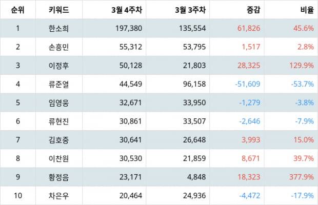 트렌드 지수 1위부터 3위까지 빅데이터로 조사한 결과, 한소희 블로그, 한소희 가방, 한소희 동생, 한소희 타투, 한소희 디올, 손흥민 이강인, 손흥민 문가영, 손흥민 연봉, 손흥민 김고은, 손흥민 엄마, 이정후 연봉, 이정후 메이저리그 연봉, 이정후 여동생, 이정후 계약, 이정후 동생 등이 주목받는 연관 검색어로 나타났다.
