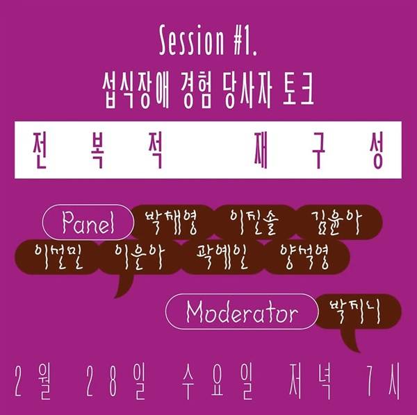 | ▲ 한국에서도 지난 2월 말, 섭식장애 경험 당사자들이 모이는 자리가 있었다. 당시 '섭식장애 인식주간' 세션1 섭식장애 경험 당사자 토크 포스터. |