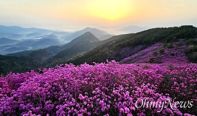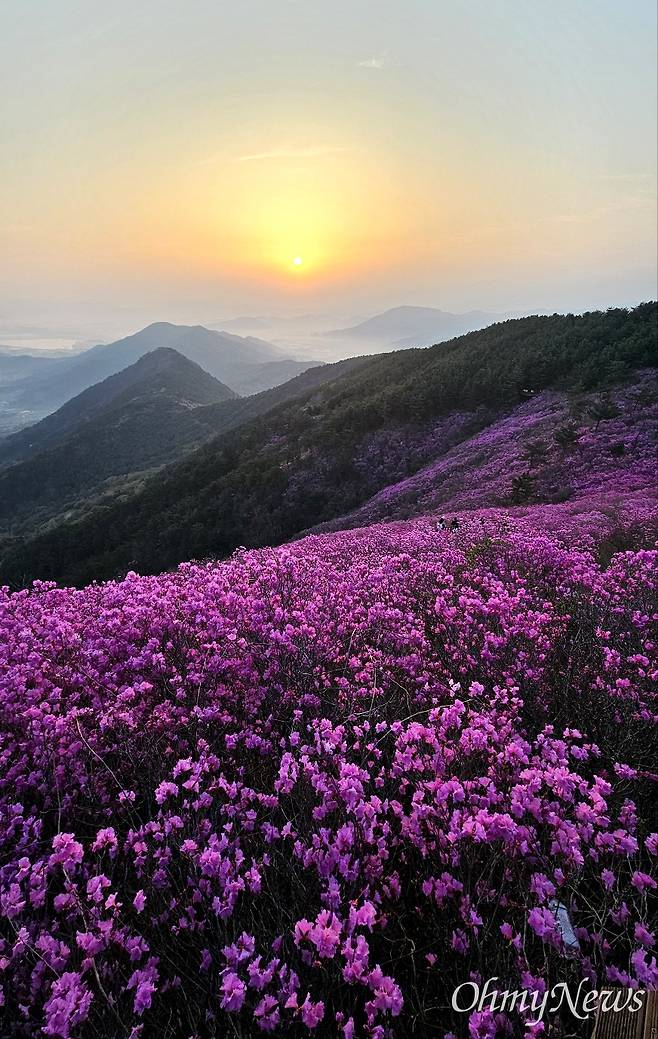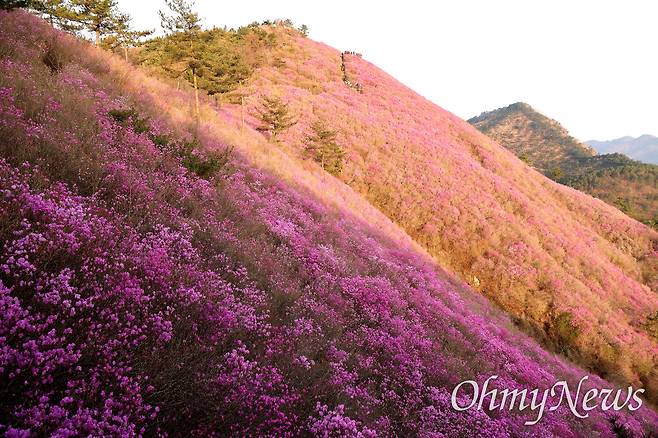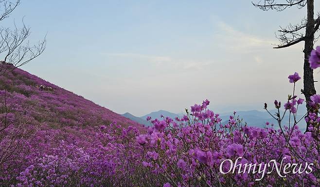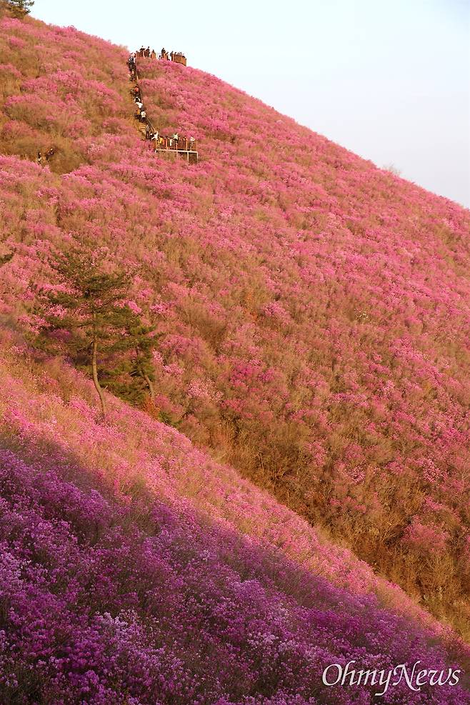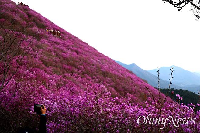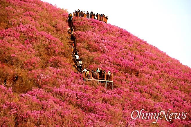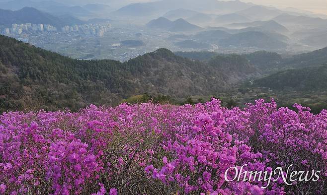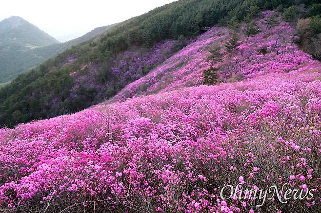 창원 천주산(해발 638.8m)이 온통 연분홍으로 변해 장관이다. 6~7일 사이 '천주산 진달래 축제'가 열리는 가운데 꽃이 만발했다. 7일 주말을 맞아 많은 상춘객들이 이곳 진달래의 아름다움을 만끽했다. 천주산 정상 부근에 진달래 군락지가 있다.