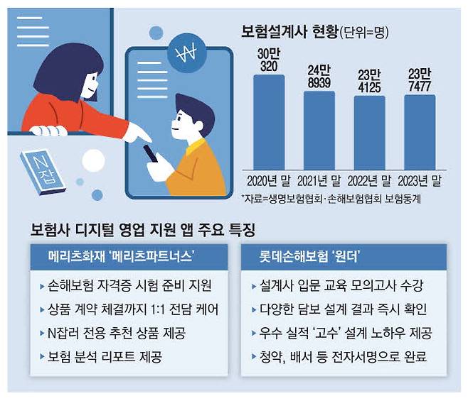 보험업계가 디지털로 설계 인력을 모으면서 최근 감소세를 보이던 보험업권 설계사 숫자도 지난해 반등에 성공했다. 2020년 말 설계사는 30만명을 넘었지만 2022년 말 기준 23만4125명으로 줄었다. 지난해 말에는 전년 말 대비 3000명 이상 늘어난 23만7477명을 기록했다.