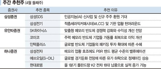 7일 삼성증권은 주간 추천종목으로 삼성전자, SK하이닉스, 현대차, 삼성SDI, 삼성물산, 현대모비스, 삼성SDS, 삼성전기, CJ, 가온칩스를 제시했다. 삼성증권은 "AI 반도체 시장 확대로 유리기판 도입 가능성이 부각되면서 관련 기업 주가도 강세"라며 "삼성전기는 적층세라믹커패시터(MLCC) 및 기판 모멘텀으로 본업 턴어라운드가 예상된다"고 전했다. 현재 국내 주요 반도체 패키징용 유리기판 기업은 삼성전기를 비롯해 앱솔릭스와 LG이노텍 등이 있다. 삼성SDS 역시 핵심 키워드는 AI다. 삼성증권은 "오는 5월 열리는 구글, 마이크로소프트(MS) 개발자회의에서 AI 관련 이벤트가 기대된다"고 설명했다.