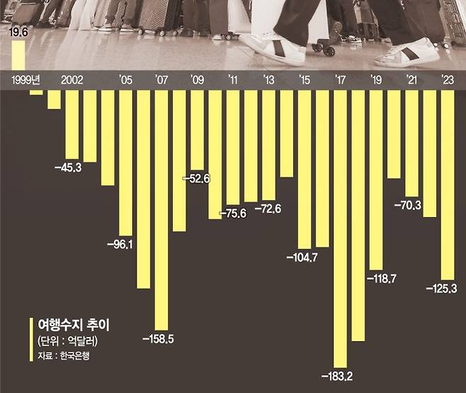 여행수지는 지난 2014년 11월에 53억1000만달러 흑자를 기록한 이후 10년간 '만년 적자' 신세를 이어가고 있다. 연도별로 보면 1999년 19억6000만달러 흑자를 기록한 이후 지난해까지 24년 동안 단 한 차례도 흑자를 내지 못했다. 특히 2020년 58억1600만달러 적자를 기록한 이후 △2021년 70억2600만달러 △2022년 83억6900만달러 △2023년 125억2700만달러 등 최근 빠른 속도로 적자액이 늘어나는 추세다.