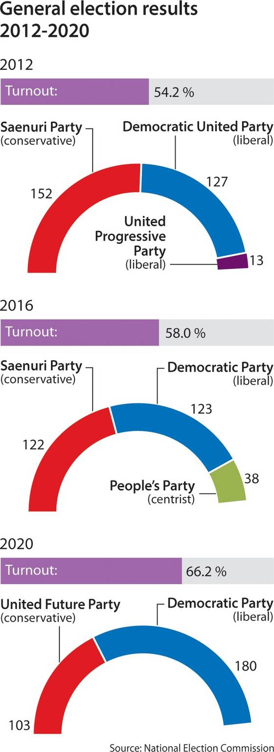 The remaining 46 spots in the legislature are filled by party-list proportional representation, but two parties on the longer ballot — the People Future Party and the Democratic United Party — are actually satellites created by the PPP and DP to gain extra seats through the parallel voting system.
