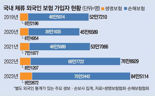한화생명 뿐 아니라 국내 보험사들도 이 시장을 ‘블루오션’으로 보고 있다. 생명보험협회에 따르면 주요 15개사의 외국인 생명보험 가입자 수는 2018년 5만5348명에서 2023년 9만2672명으로 늘었고, 전체 가입자 중에서 차지하는 비중도 1.5%에서 2.3%까지 올랐다. 주력 상품이 장기보험이고 손해보험과는 달리 인적 담보가 있어야 한다는 점을 감안하면 증가세가 적지 않은 셈이다.