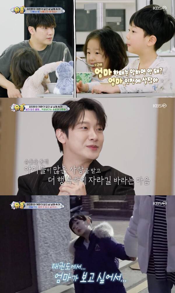 7일 방송된 KBS2 '슈퍼맨이 돌아왔다'에서는 첫째 아들 최재율, 쌍둥이 최아윤, 최아린 등 삼남매의 아빠 최민환이 출연했다.