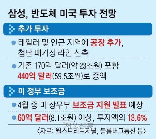 WSJ에 따르면 삼성전자는 텍사스주 반도체 투자를 기존 170억 달러(약 23조원)에서 440억 달러(59조 5000억원)로 확대한다. 현지 투자를 두 배 이상으로 확대하겠다는 것으로 현실화되면 TSMC의 400억 달러(애리조나주에 투자)를 넘어선다. 삼성전자는 이 보도에 대해 공식 입장을 밝히지 않았지만 추가 투자 발표 가능성은 이전부터 제기돼 왔다. 앞서 블룸버그통신도 지난달 15일 삼성전자가 60억 달러(8조 1000억원) 이상의 보조금을 받을 것으로 보도하면서 상당한 추가 투자 계획도 함께 발표될 예정이라고 전했다.