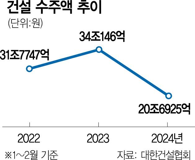 7일 대한건설협회에 따르면 올 1~2월 국내 건설사들의 건설 수주액은 전년 동기(34조 146억 원) 대비 약 39% 감소한 20조 6925억 원에 그쳤다. 이는 1~2월 기준 2019년(18조 543억 원) 이후 5년 만에 가장 적은 금액이다.