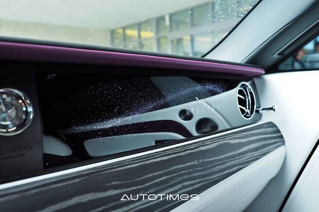 이 뿐만이 아니다. 스펙터에는 선택으로 도어에도 LED 조명을 넣을 수 있다. 안쪽에는 4,796개의 별을 코치도어 안쪽에 새겨 넣은 '스타라이트 도어'다. 이와 함께 5,584개의 별무리와 스펙터 네임 플레이트로 이루어진 '일루미네이티드 페시아'를 조수석 패널에 적용했다. 어두운 터널이나 야간에는 신비로운 밤하늘을 그대로 옮겨 놓은 것 같은 분위기를 연출한다.